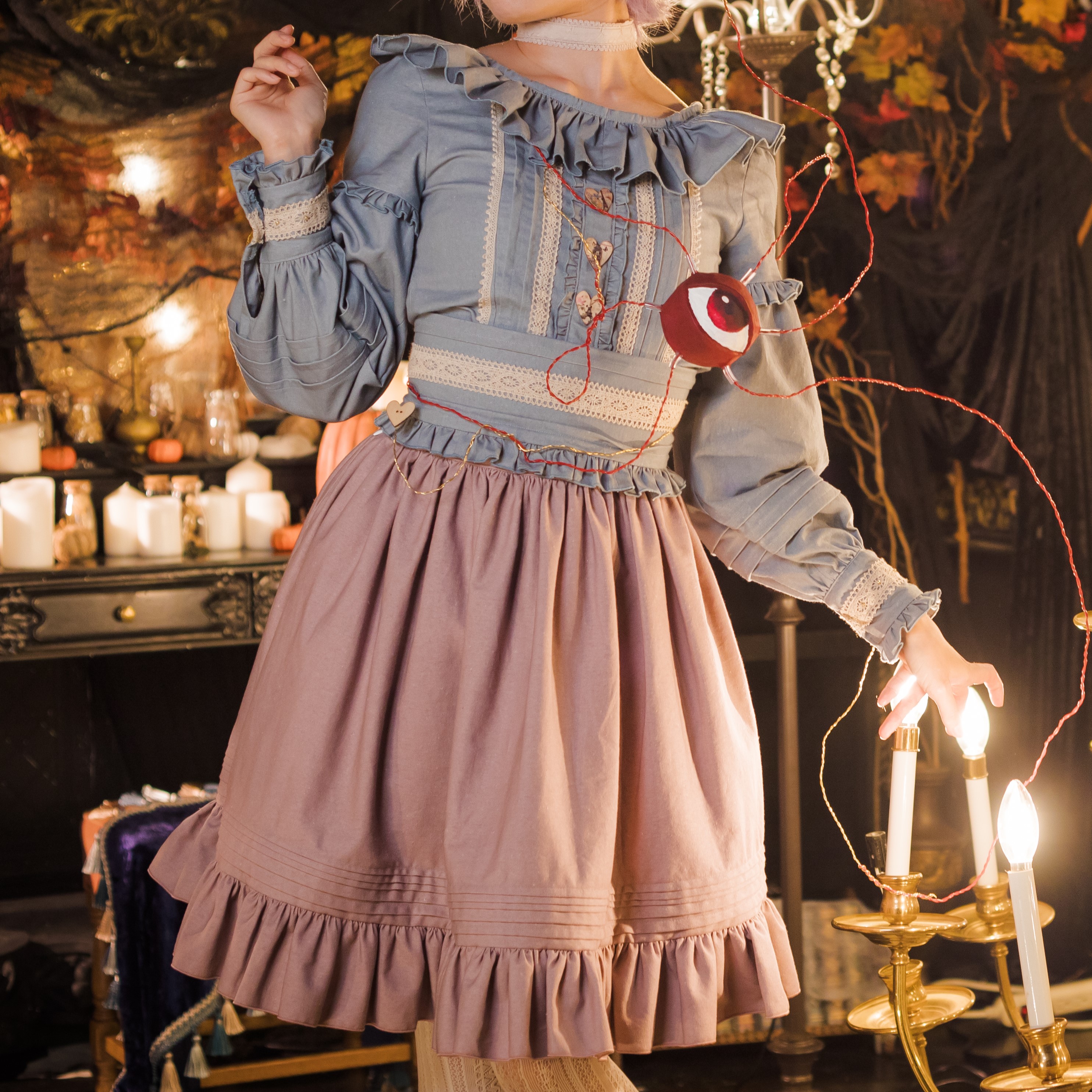地霊殿の薄暗い空気感を衣装に投影するため、素朴な風合いを持つ麻素材を使用した彩度の低いくすんだ色味の布やレースでまとめあげました。