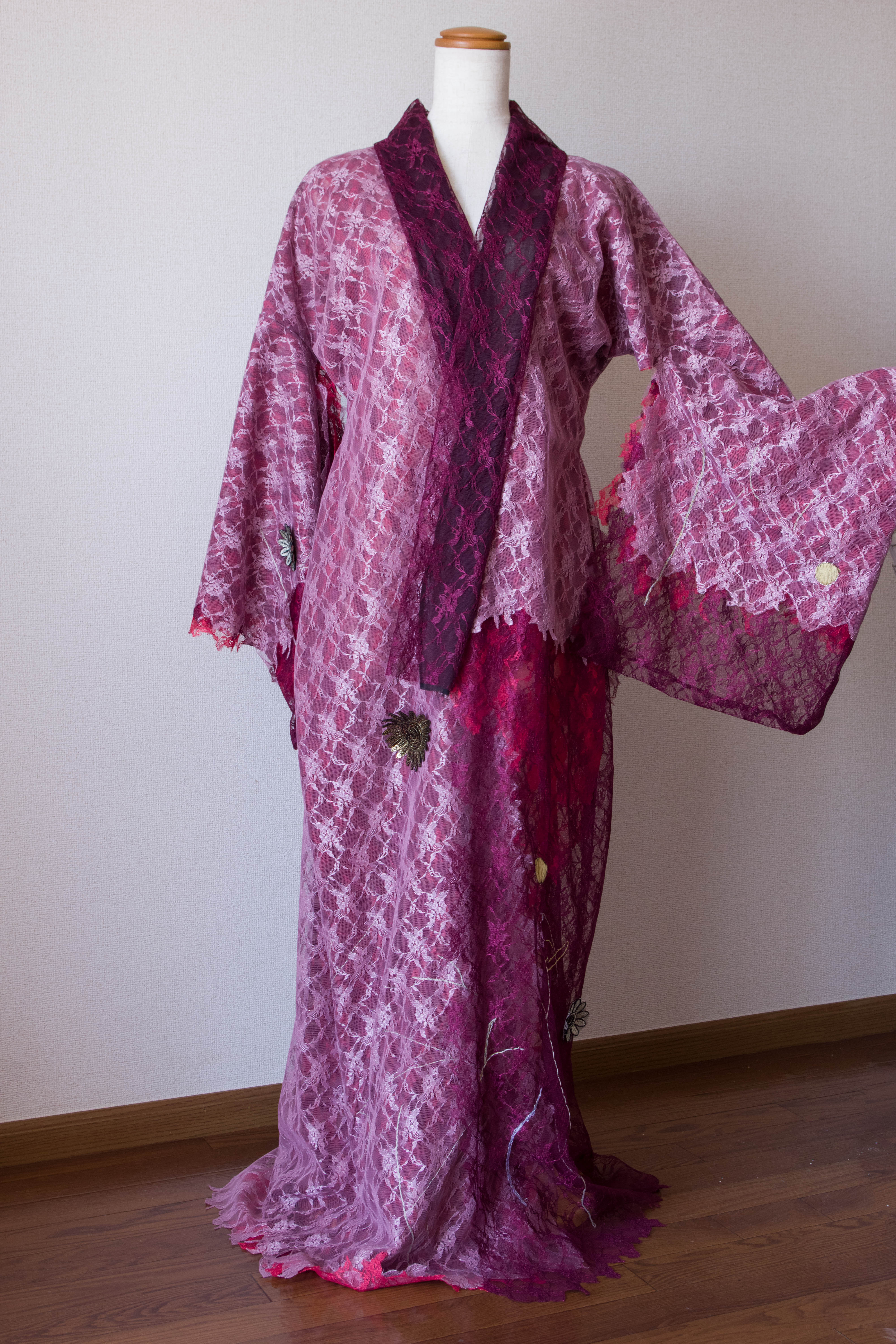 ベースの着物部分はハリのあるレースを重ねて使用し、グラデーションを表現しました。