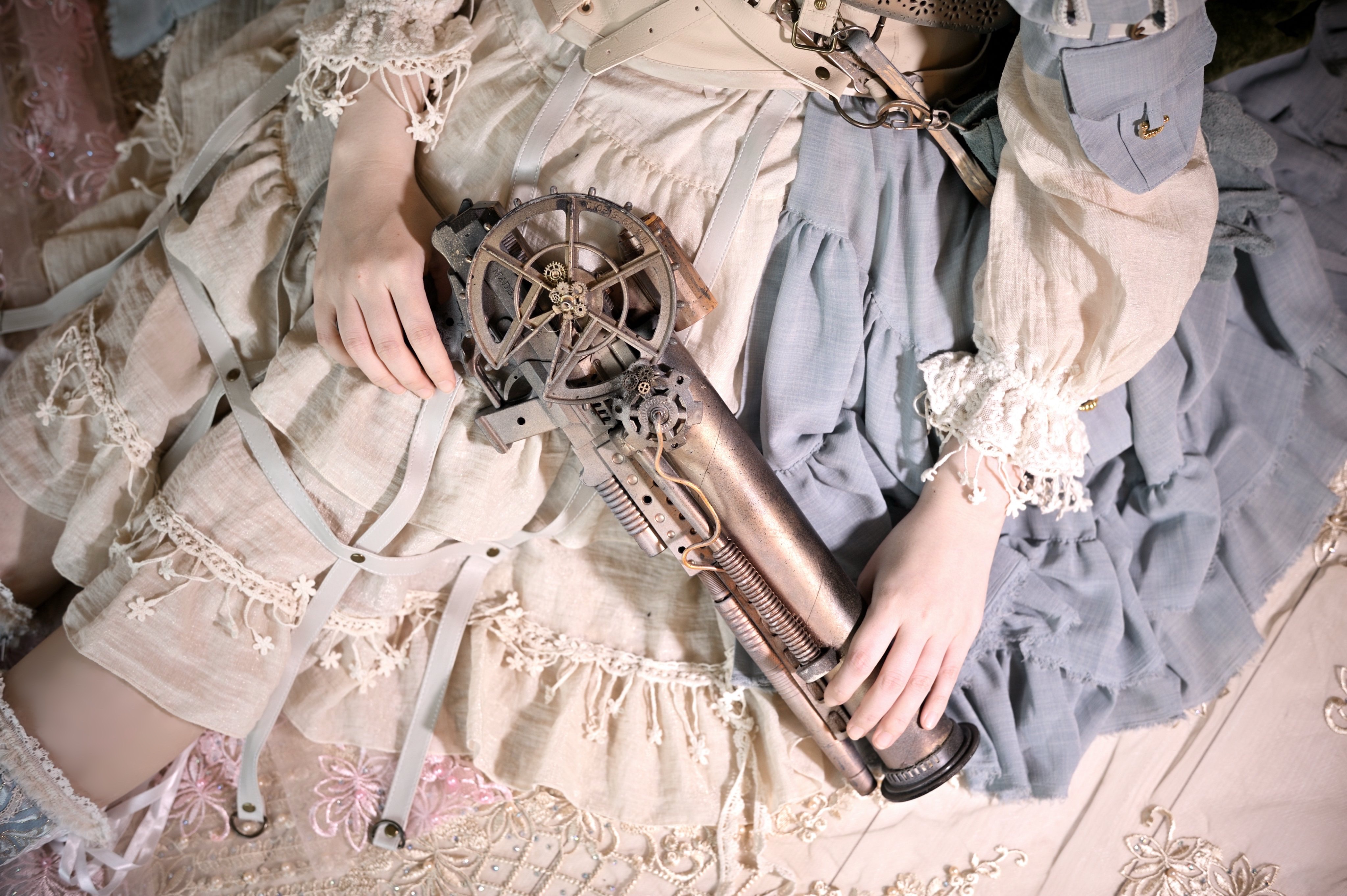 メカニカルですす汚れたスチームパンクと相反する可愛いロマンチックさをMIXしました。