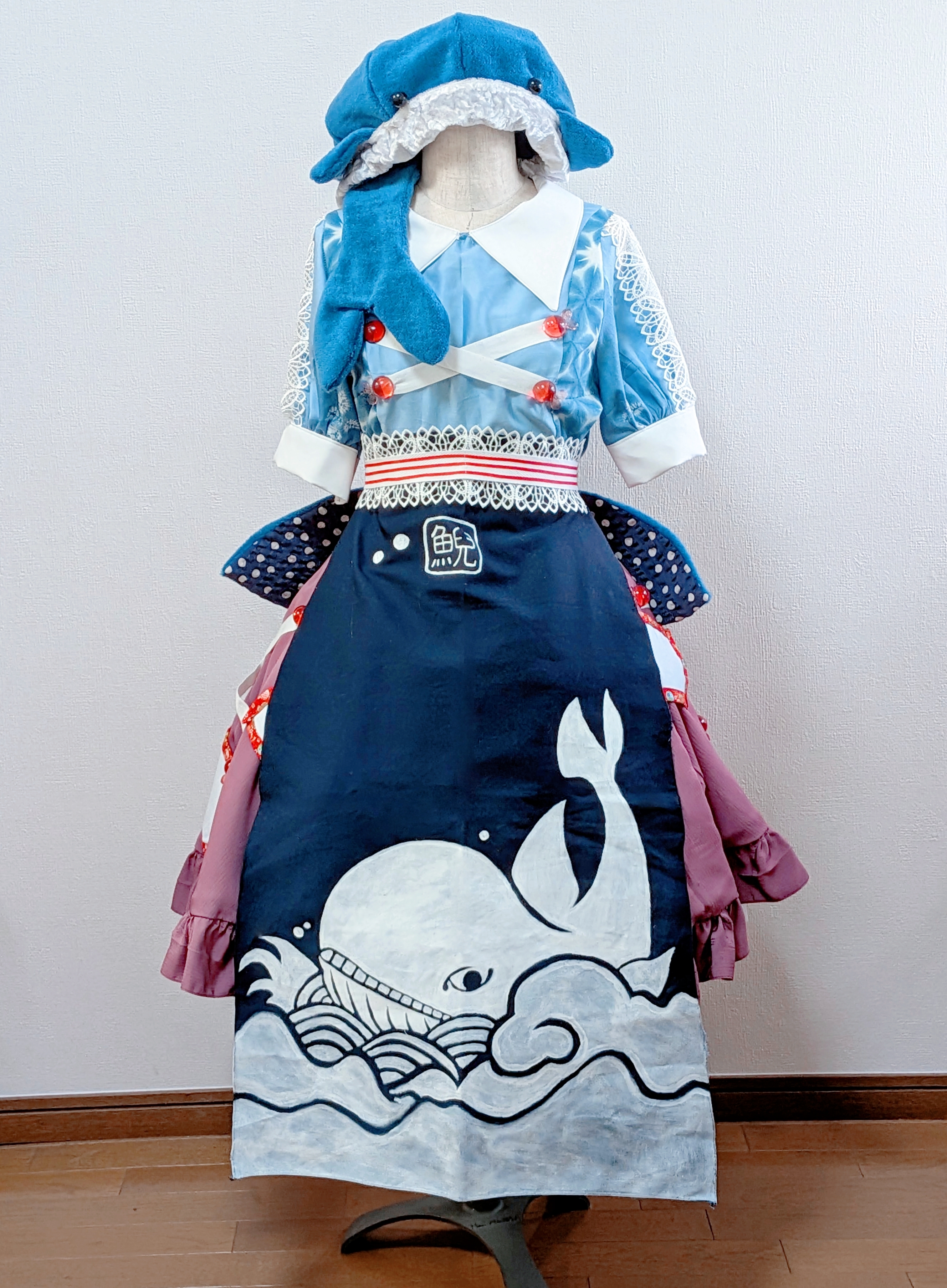 クジラの前掛けと赤のクジラ型の装飾は友神すみす(@tomogami_s)に作成してもらいました。