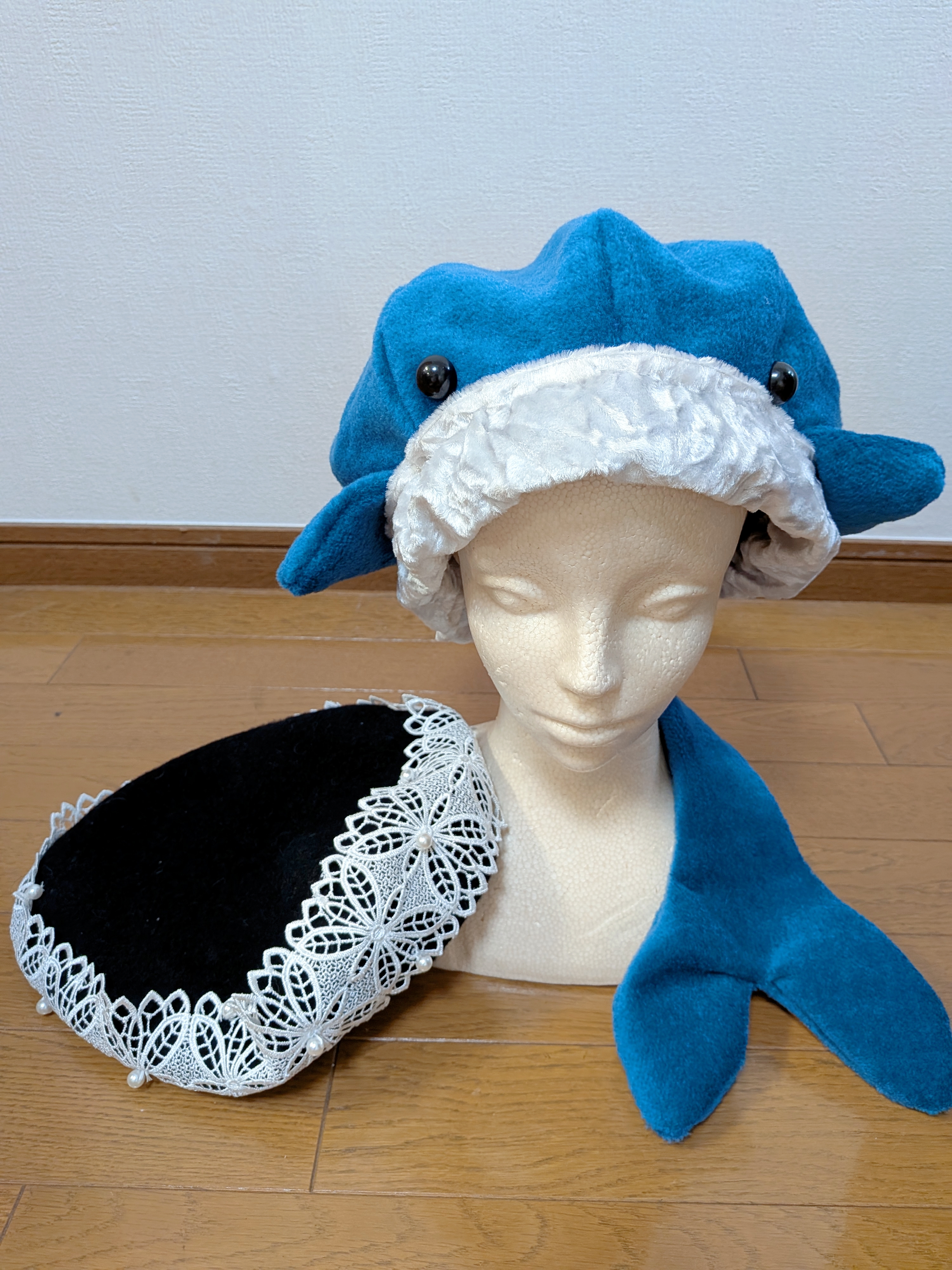 特徴的なくじらの帽子も自分が使用しなくなったベレー帽のを土台に使用し、ついていたレースをいたる袖や前掛けなど使用し無駄にしないようにしています。