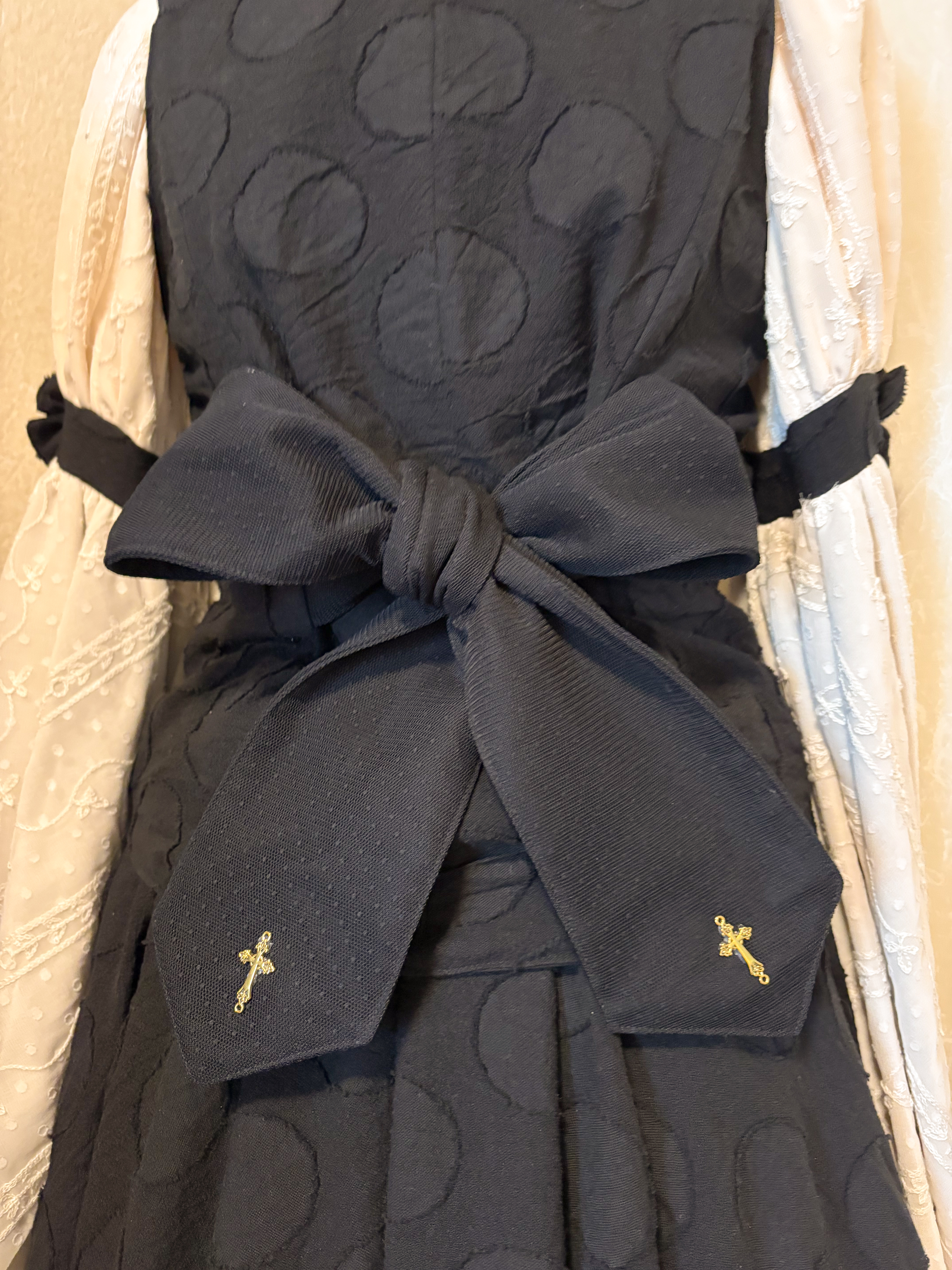 十字架モチーフを帽子やジャケット、ネクタイに散りばめました。